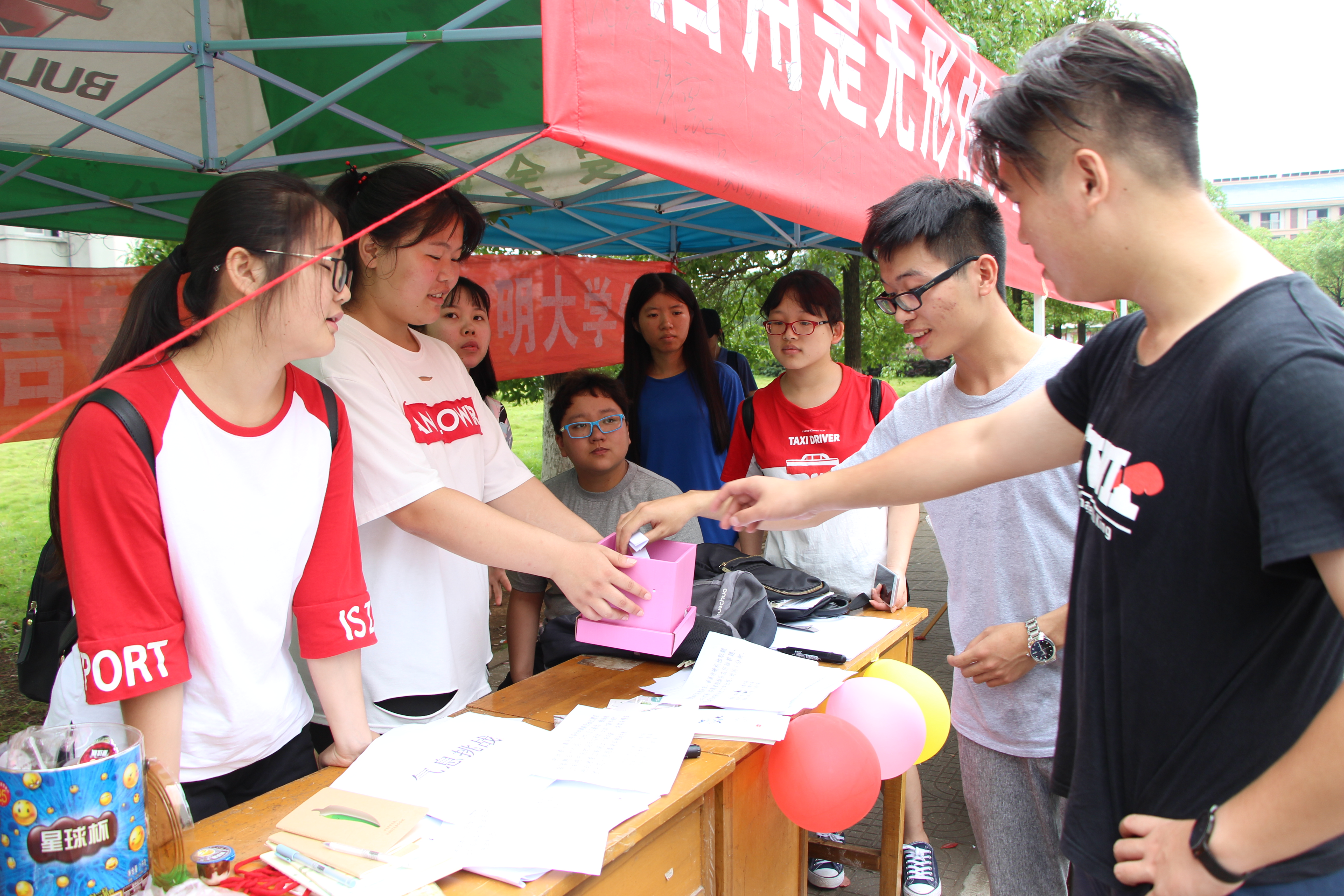 活动期间,赵晗冰老师和王嘉敏老师也“玩”起了你画我猜的小游戏,在一分钟规定时间内,她们接连猜出小鸟依人、人造卫星等五道题目,获得一等奖随身双用小风扇,用行动表达了她们对此次活动的支持。赵华老师表示,游戏很有意思,并提醒玩游戏的同时要做好主要工作,将资助政策有效地传达给同学们。之后,各位老师在横幅上签上了他们的名字。
